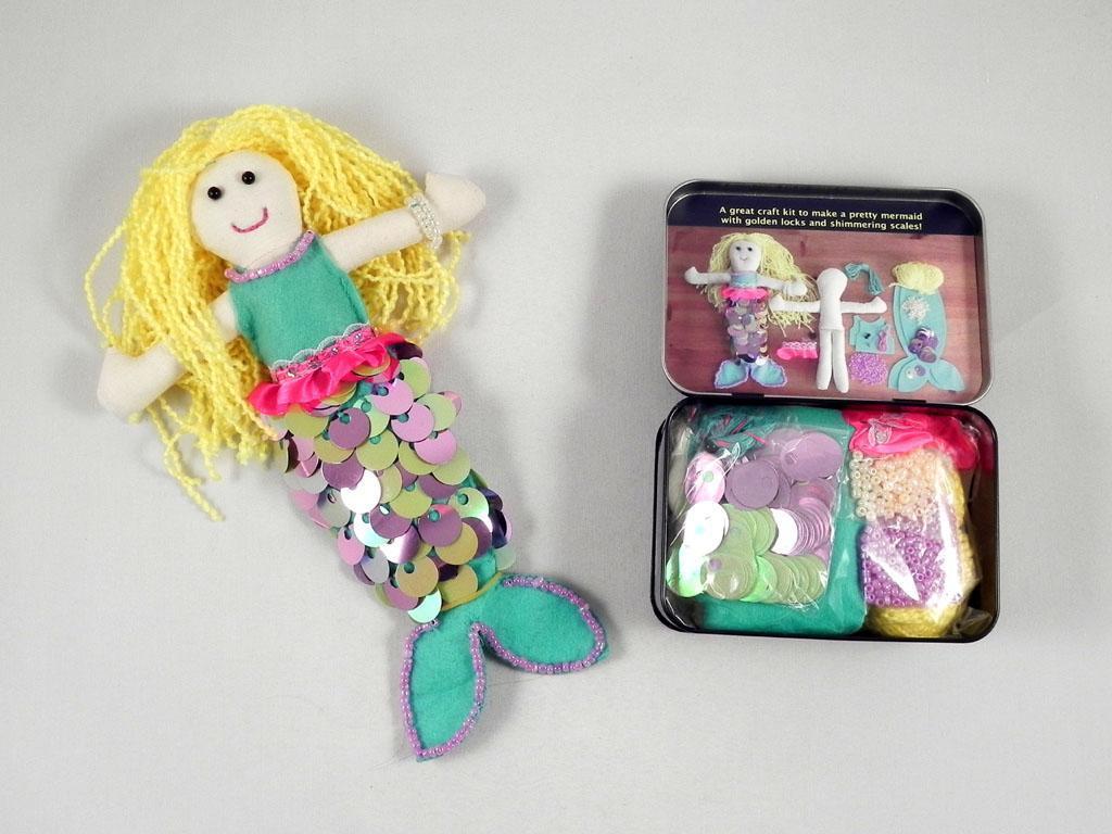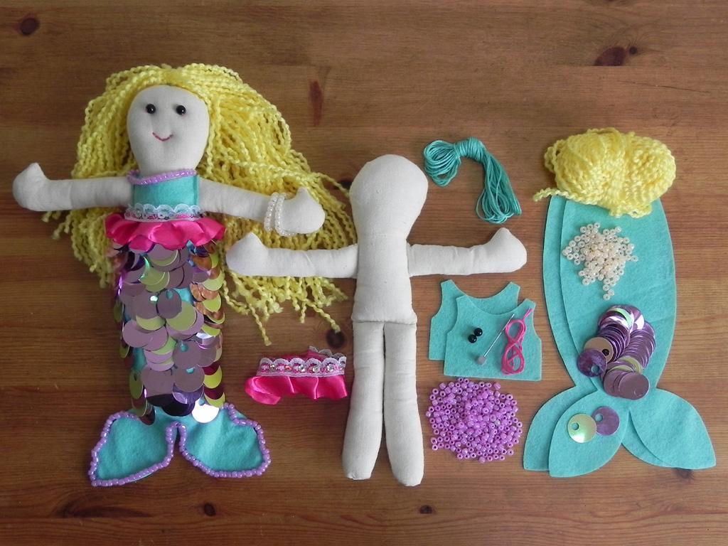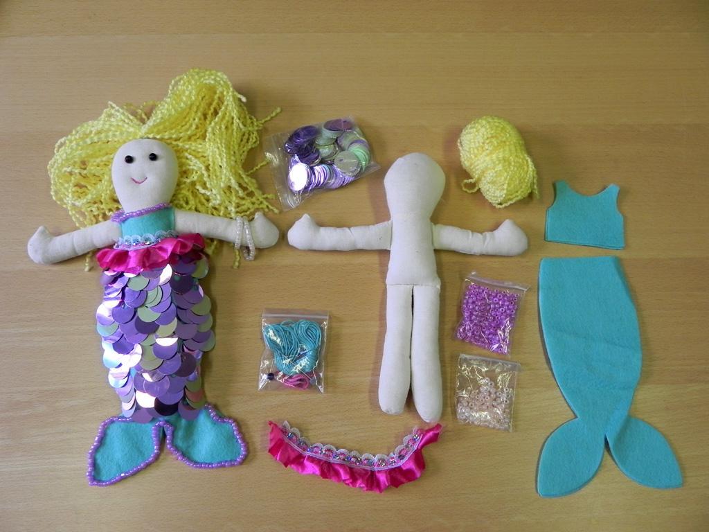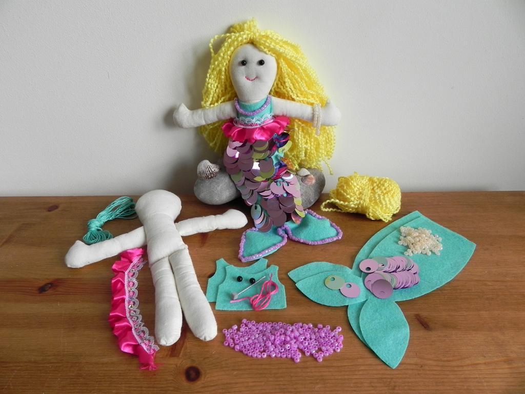 Inhalt: Meerjungfrau Körper, Filzkleidung, Pailletten, Wolle, Perlen, Nadel, Faden und Anleitung