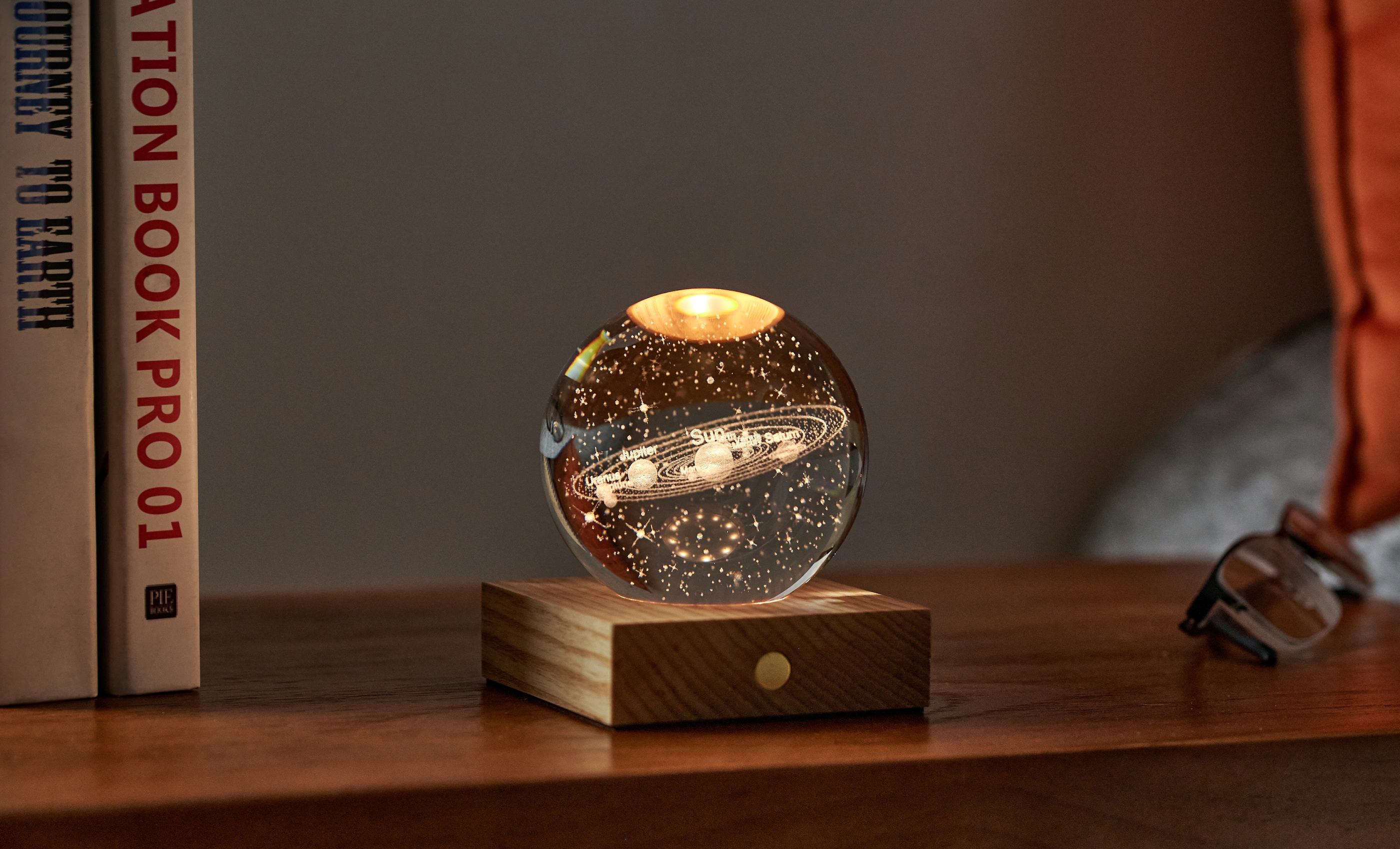 Amber Crystal Light Sonnensystem, Basis FSC-zertifiziertes Holz, 3 Lichtstufen, Kugel 3D lasergedruckt