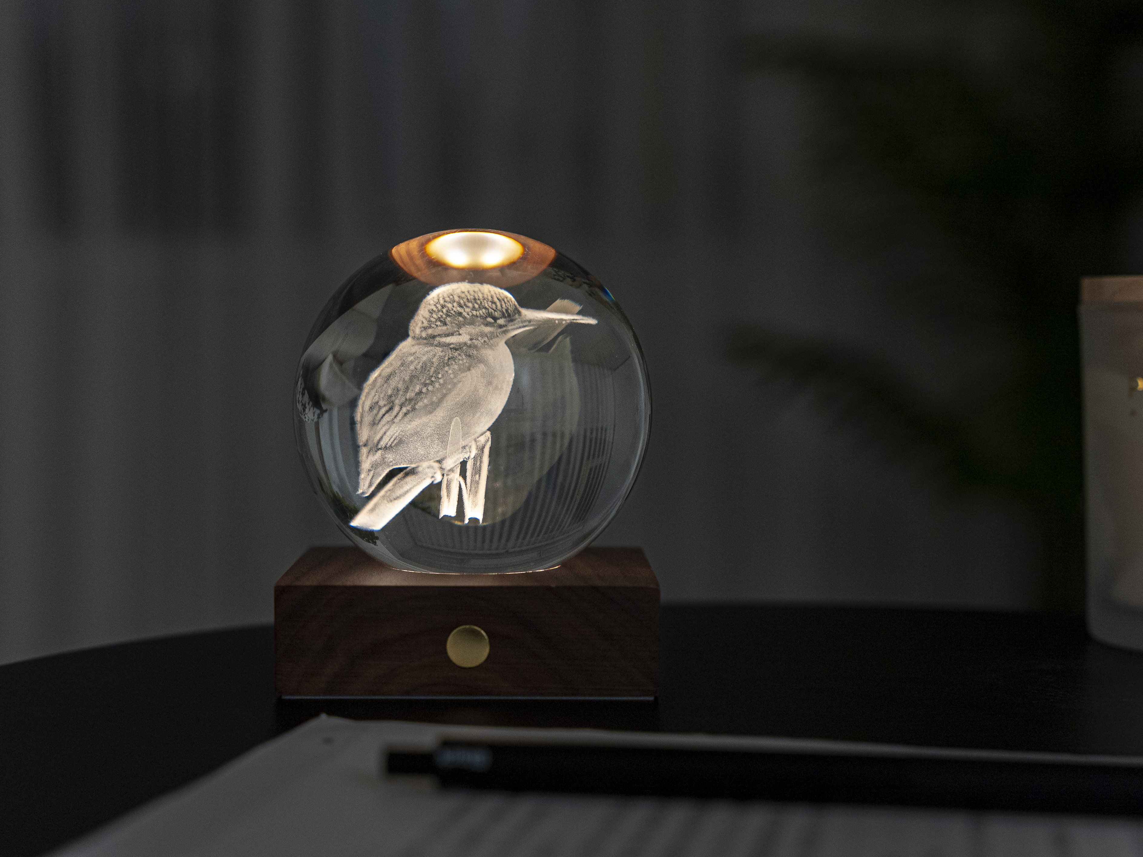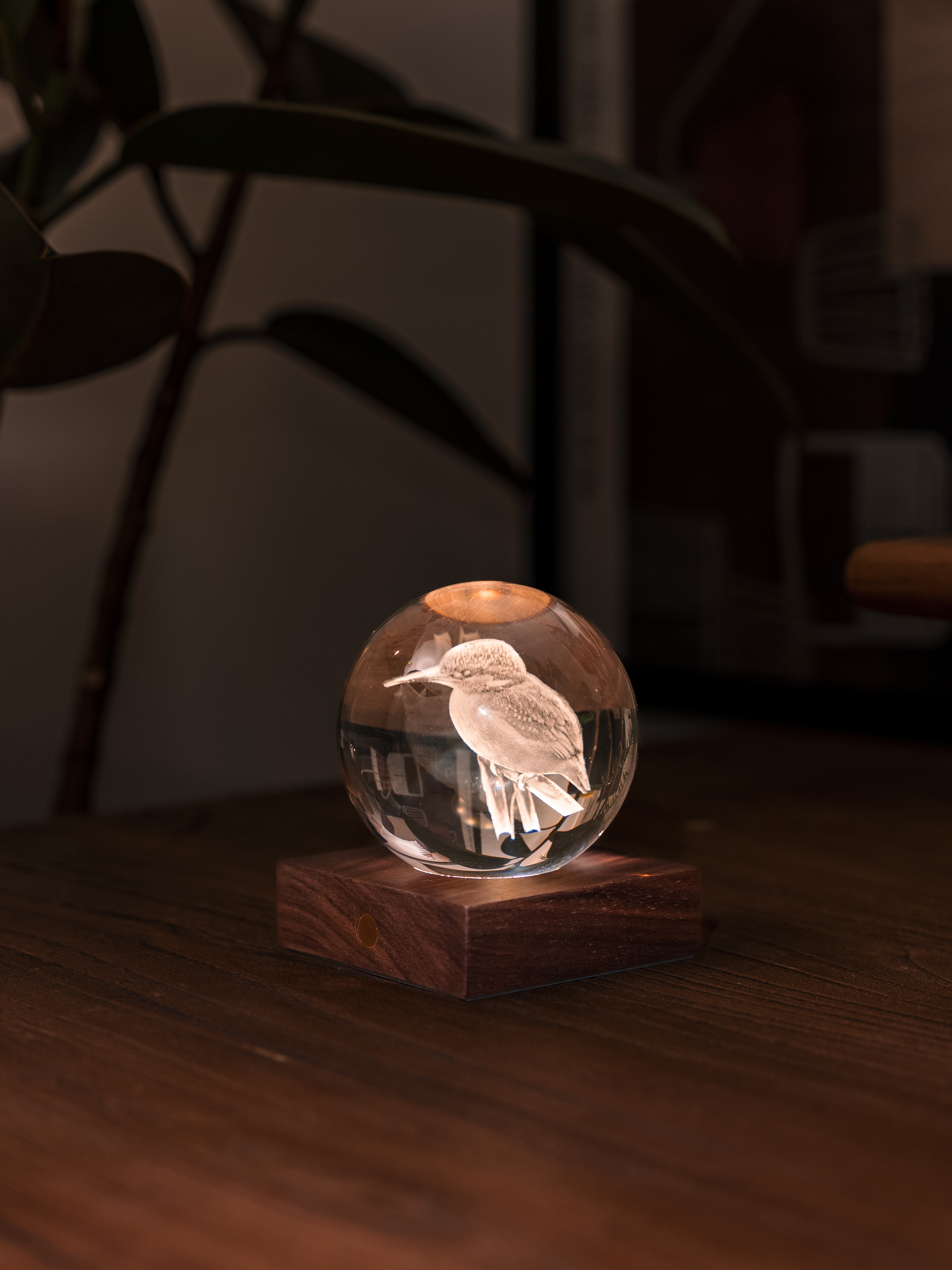 Amber Crystal Light Eisvogel, Basis FSC-zertifiziertes Holz, 3 Lichtstufen, Kugel 3D lasergedruckt
