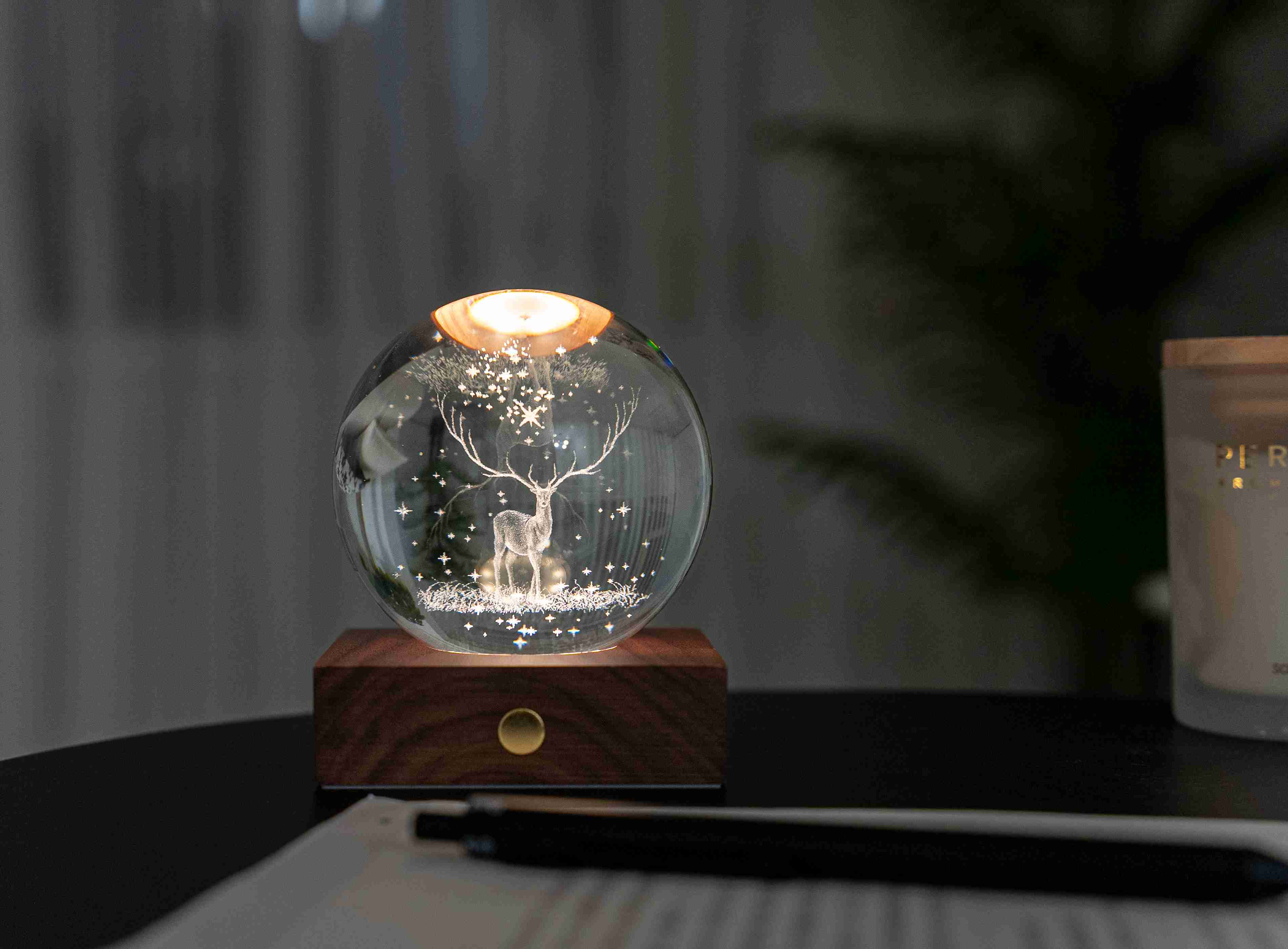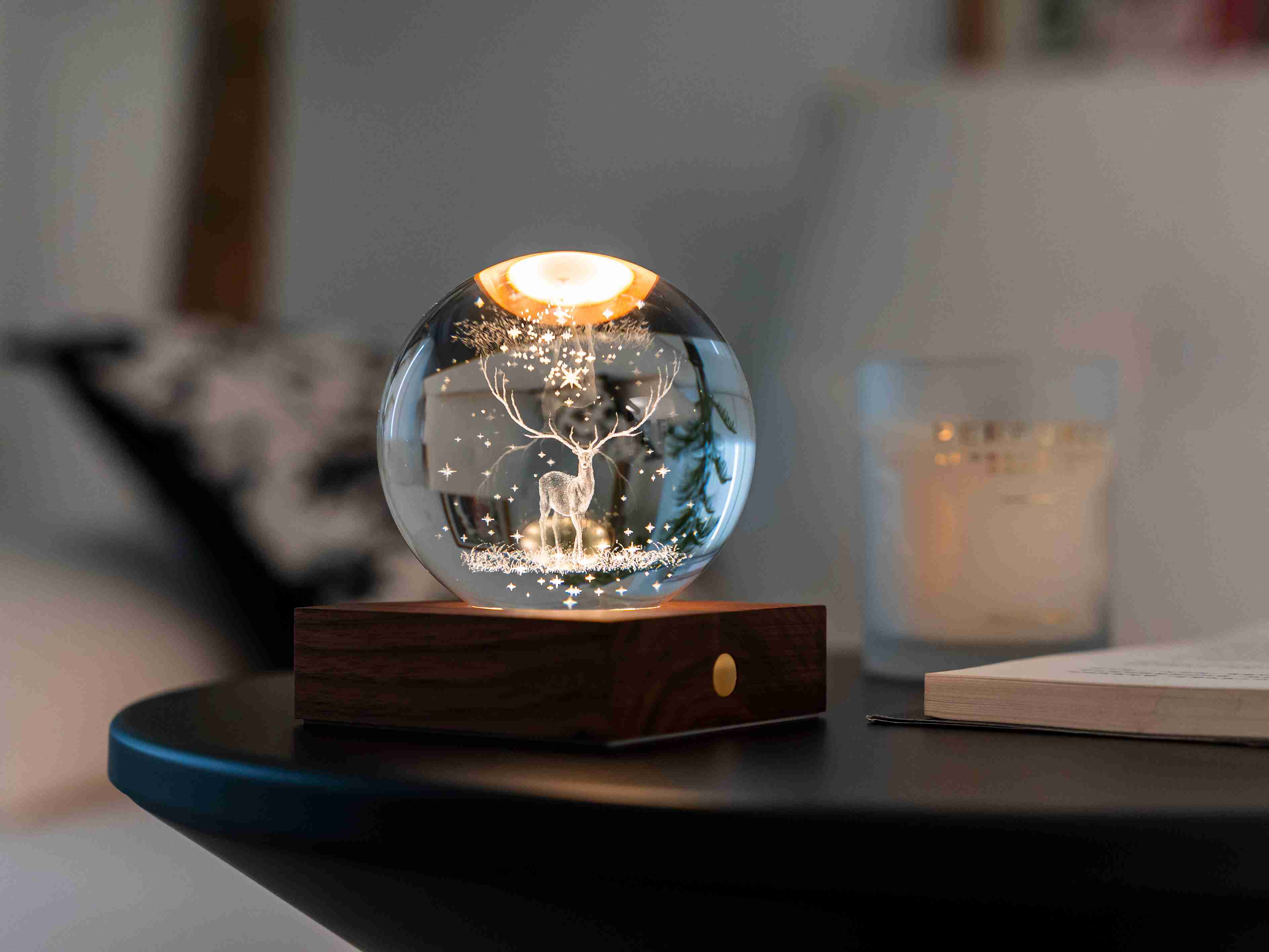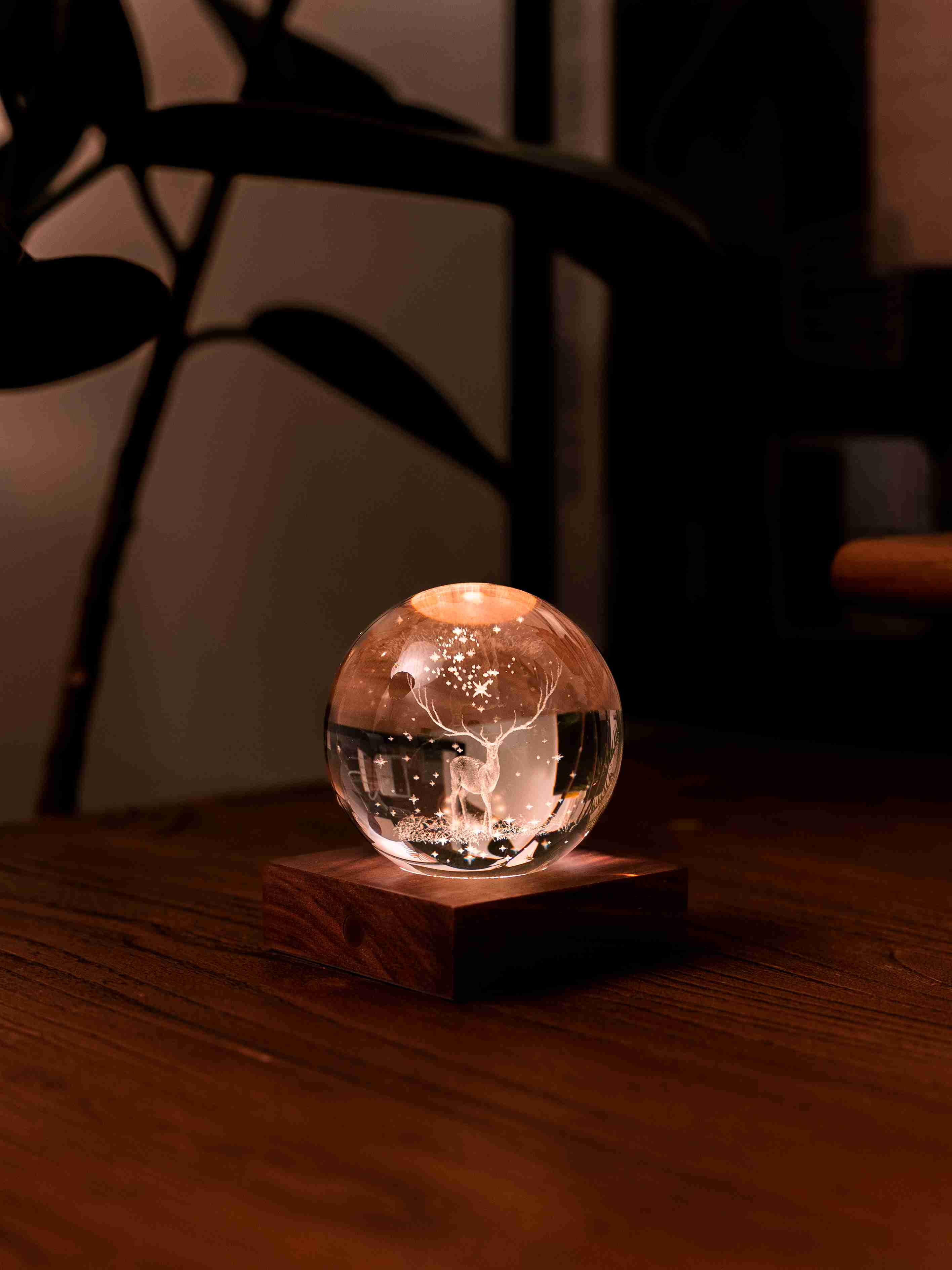 Amber Crystal Light Hirsch, Basis FSC-zertifiziertes Holz, 3 Lichtstufen, Kugel 3D lasergedruckt