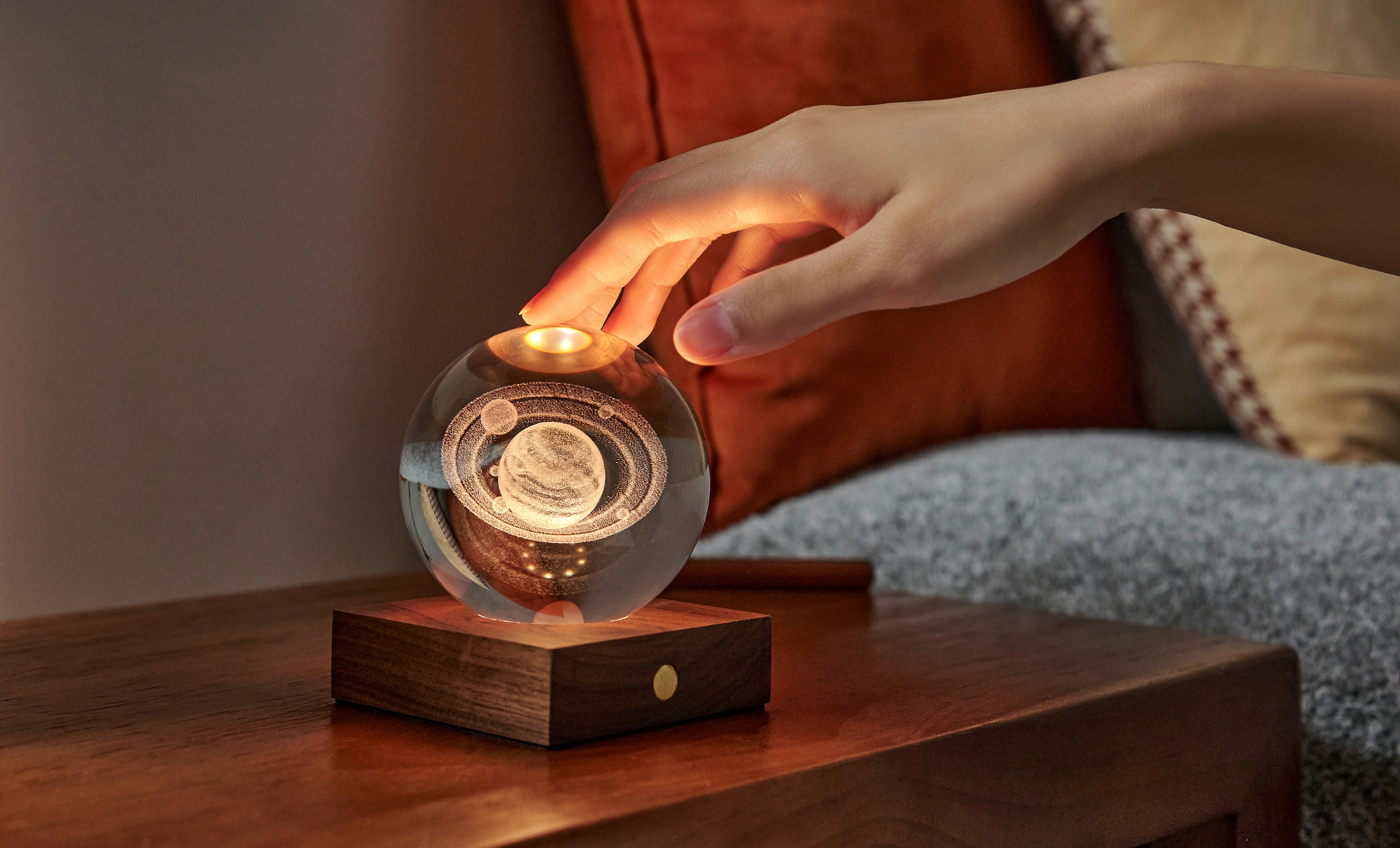 Amber Crystal Light Saturn, Basis FSC-zertifiziertes Holz, 3 Lichtstufen, Kugel 3D lasergedruckt