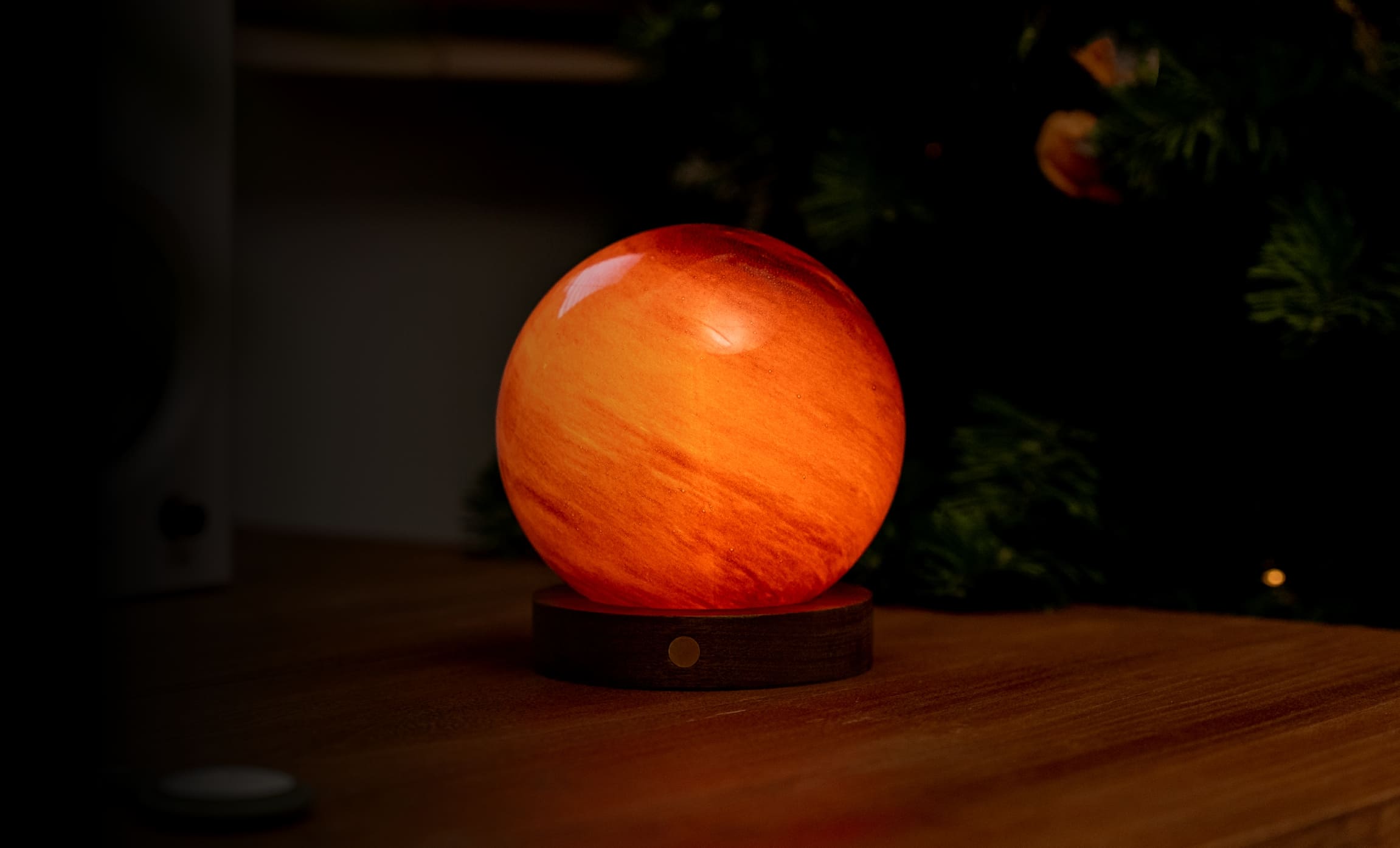 Basis FSC-Nussbaum, wechselndes Licht in 7 Farben, dimmbar, Glaskugel handbemalt