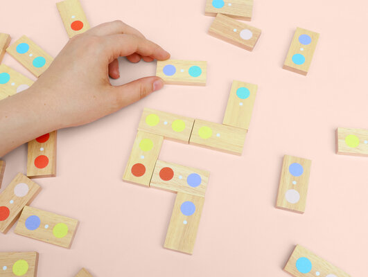 Dot to Dot - Gesellschaftsspiel Farbdomino aus Holz mit 28 Holzsteinen