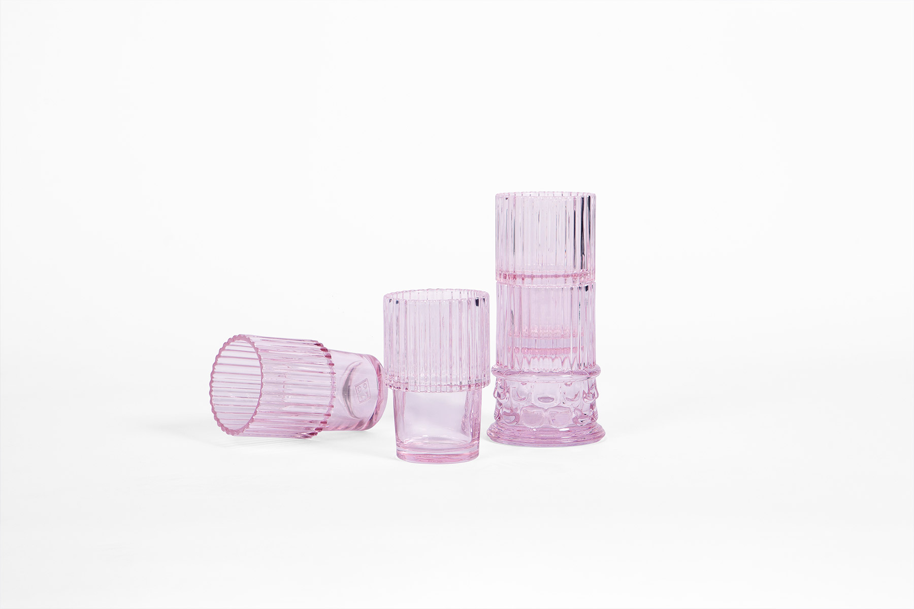 Elegantes Set aus vier Gläsern, die gestapelt eine ionische, klassische griechische Säule bilden