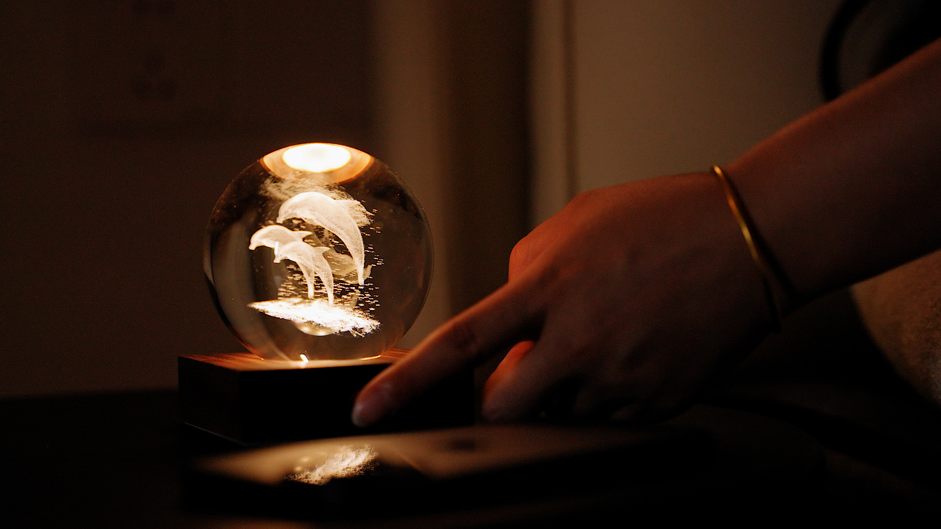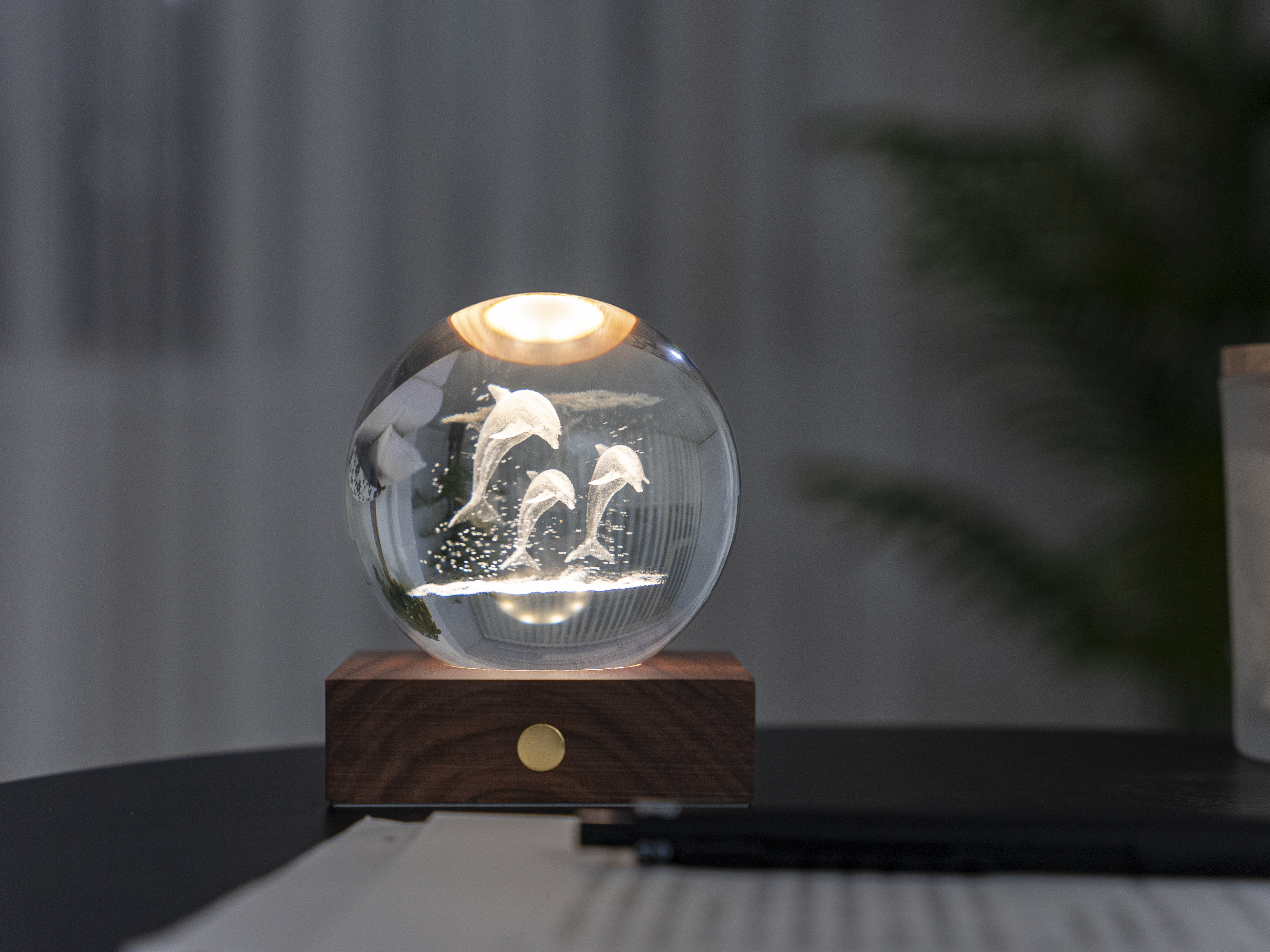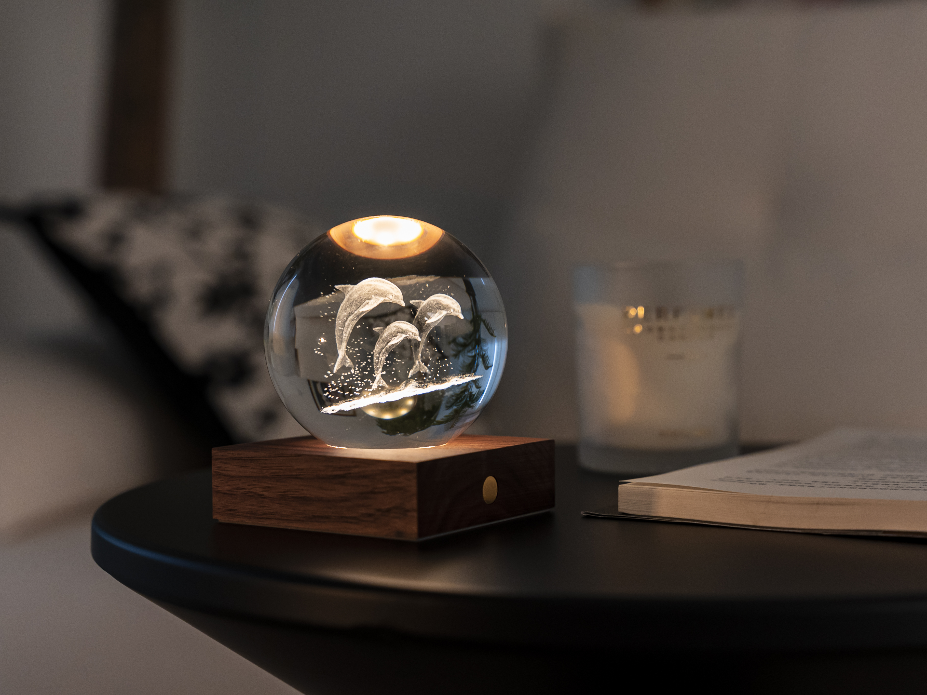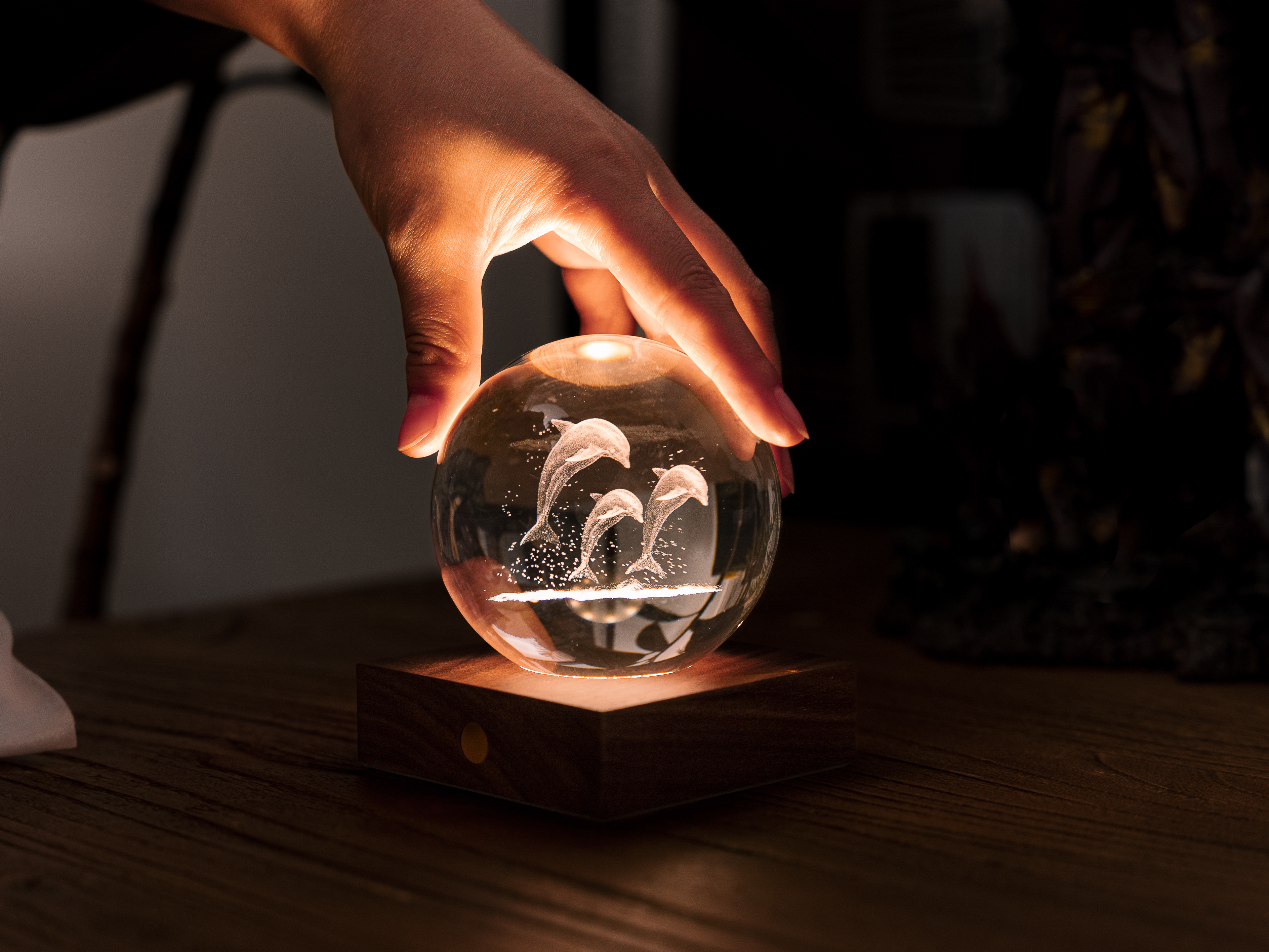 Amber Crystal Light Delphine, Basis FSC-zertifiziertes Holz, 3 Lichtstufen, Kugel 3D lasergedruckt