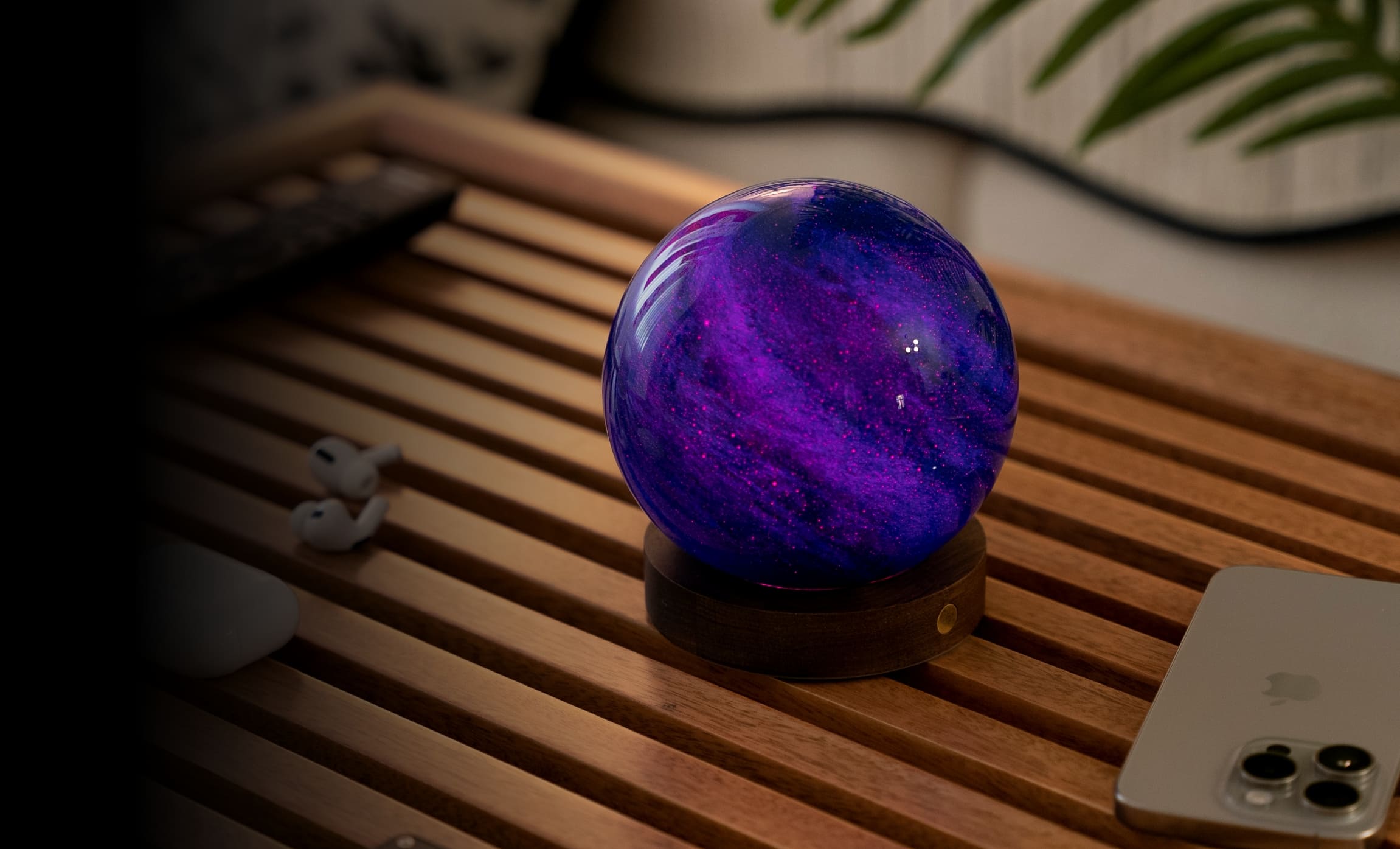 Astra Glass Light Mini Galaxy Breeze - Stimmungslicht Basis FSC-Nussbaum, wechselndes Licht in 7 Farben, Glaskugel handbemalt