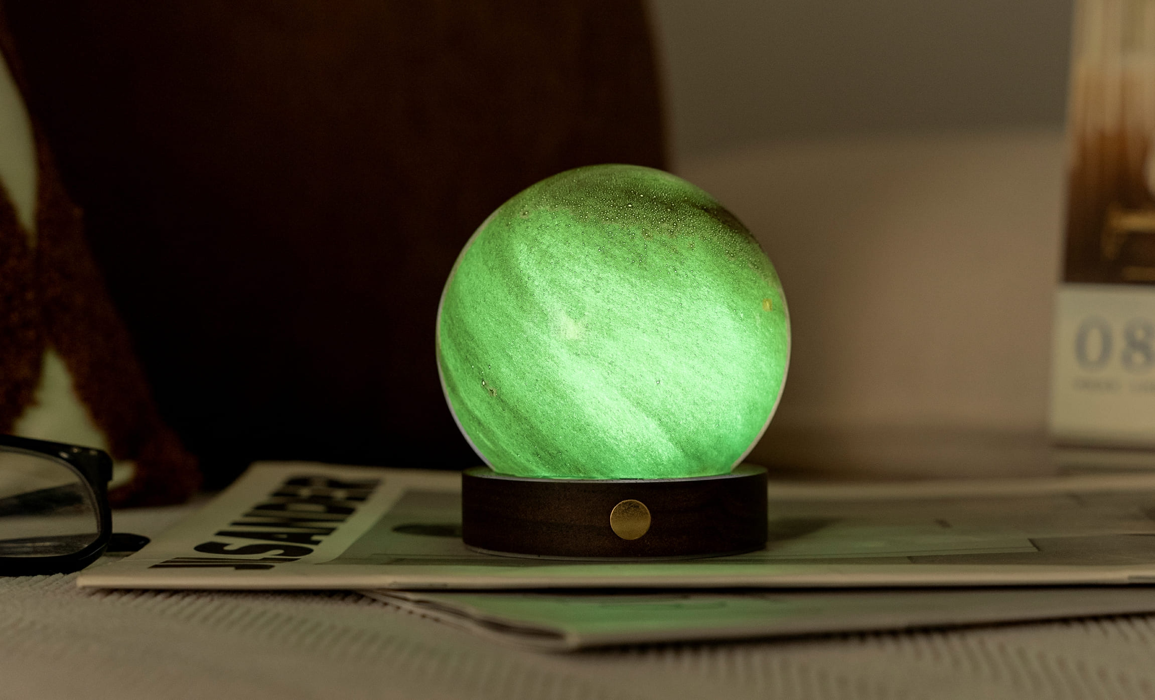 Basis FSC-Nussbaum, wechselndes Licht in 7 Farben, Glaskugel handbemalt