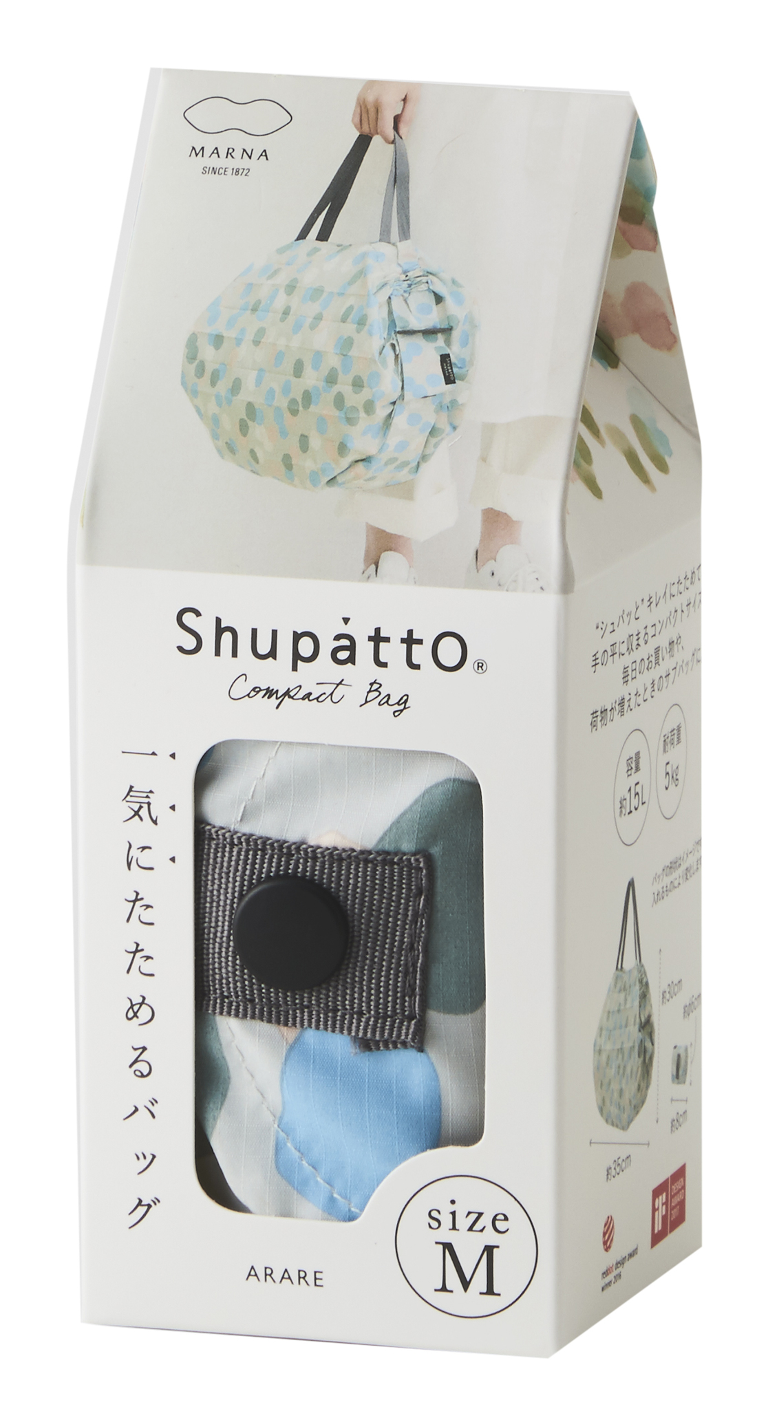 Compact Bag M - ARARE - Faltbare Einkaufstasche One-Pull (patentiert) ARARE (Hailstones), Mehrfarbig (Weiss/Hellblau), Grösse M - gefaltet 8x6 cm, 15 l