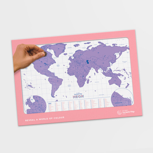 PURPLE NEON SCRATCH MAP Weltrubbel-Poster A3, bereiste Länder aufrubbeln und sie erscheinen grün
