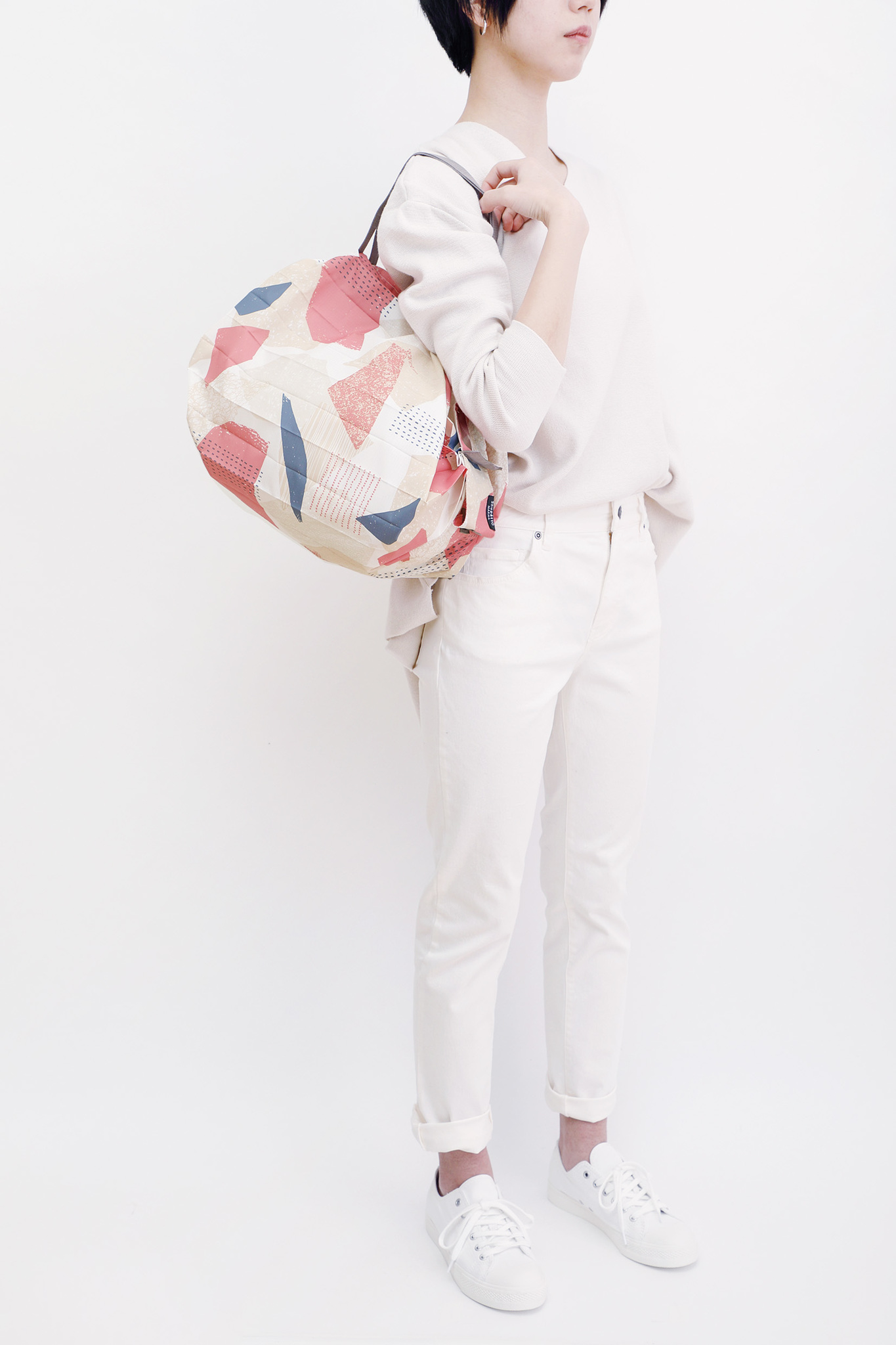 Compact Bag M - HAGIRE - Faltbare Einkaufstasche One-Pull (patentiert) HAGIRE (Scraps), Mehrfarbig (Rosa/Weiss/Blau), Grösse M - gefaltet 8x6 cm, 15 l