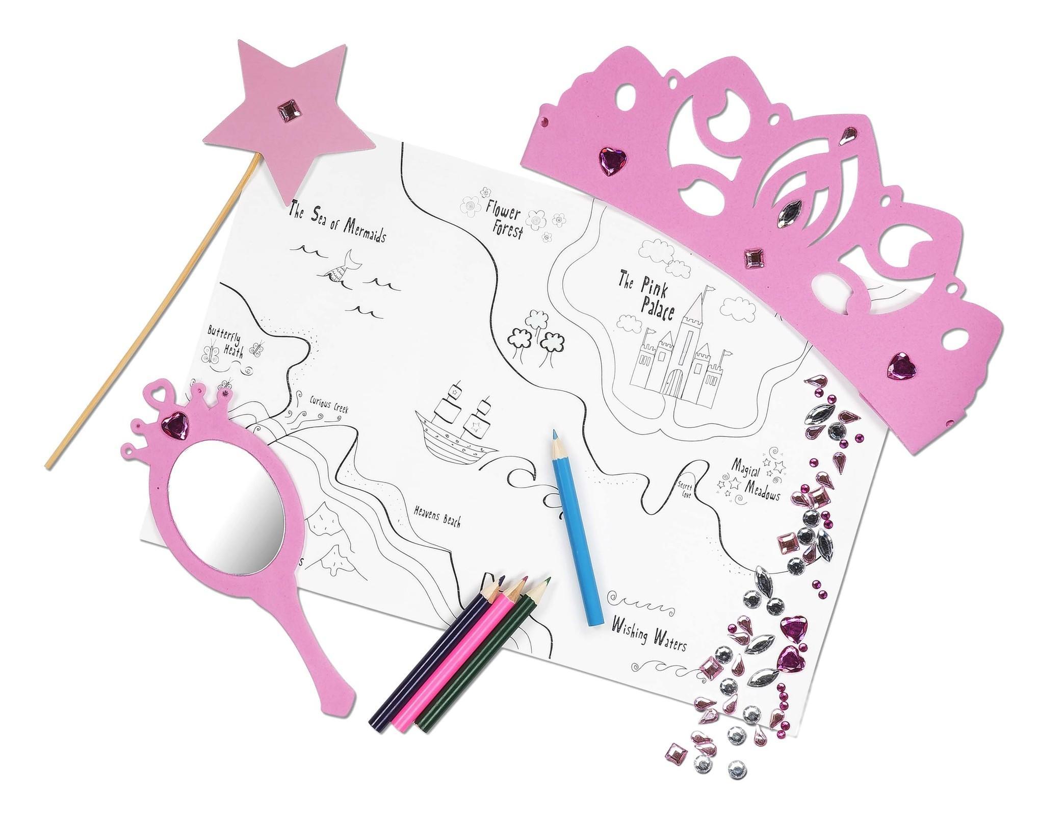 Dieses Kit enthält alles, was Sie benötigen, um Ihr eigenes Diadem, Prinzessin-Spiegel und Zauberstab ,zu basteln. ,Ausserdem enthält dieses Kit eine Karte von deinem Reich, ,Farbstifte ,und einen Edelstein-Aufkleber. Das Ganze ist ein einem Koffer verpackt.