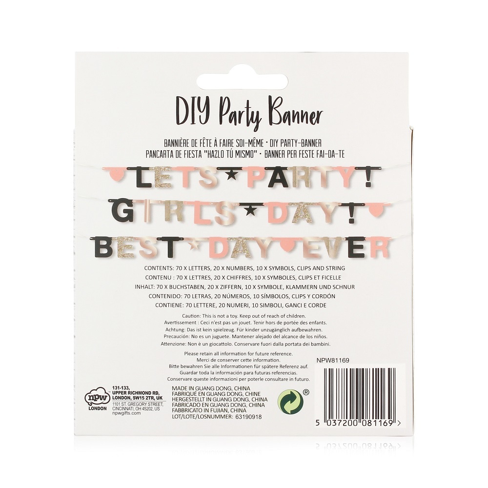 Personalisieren Sie Ihre Botschaft und halten Sie Ihr Partythema im Blick. Dieser Party Banner besteht aus 70 Buchstaben und 20 Zahlen in einer üppigen Palette aus Goldglitzer, Roségold, Schwarz und Pink und verleiht Ihren besonderen Worten Klasse und Glanz.